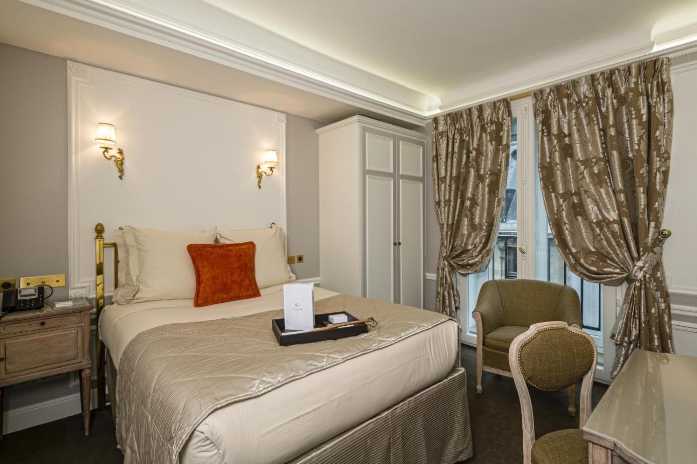 Chambre Prestige Louvre. Cette chambre spacieuse allie parfaitement le confort et la modernité à une décoration parisienne traditionnelle. Elle offre une vue imprenable sur le célèbre musée du Louvre. Les tons brun riche, beiges ou rouges prédominent afin de créent une atmosphère chaleureuse et accueillante. Vous profiterez d’un confort ultime grâce aux draps de qualité. Dans certains hébergements, le lit queen-size peut être converti en lits jumeaux, sur demande. La salle de bains moderne et luxueuse est pourvue dune baignoire, où vous pourrez vous détendre. Veuillez noter que cet hébergement ne peut accueillir aucun lit d’appoint.