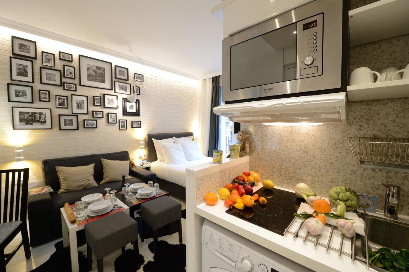 Studio 304. Cet appartement comprend une chambre. La salle de bains est pourvue d’une douche et d’articles de toilette gratuits. La kitchenette bien équipée est munie de plaques de cuisson, d’un réfrigérateur, d’un micro-ondes et d’ustensiles de cuisine. Offrant une vue sur la cour intérieure, cet appartement insonorisé dispose d’un lave-linge, d’un plateaubouilloire et d’une télévision à écran plat. Ce logement comporte 2 lits.